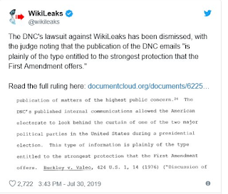 “Vụ kiện của DNC chống lại WikiLeaks đă bị bác bỏ, với thẩm phán lưu ư rằng việc đăng các email của DNC ‘rơ ràng thuộc loại được bảo vệ mạnh mẽ nhất mà Tu Chính án số Một cung cấp.”