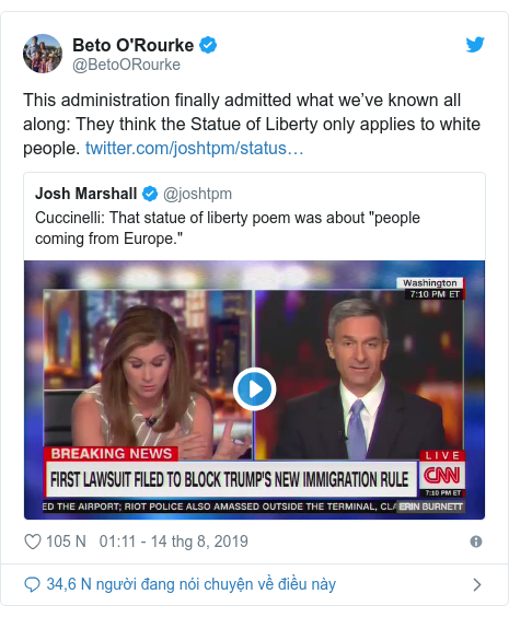 Beto O'Rouke, một ứng cử viên tổng thống đảng Dân chủ từ Texas, chia sẻ một đoạn clip từ cuộc phỏng vấn và cho biết các b́nh luận cho thấy chính quyền của ông Trump "nghĩ rằng Tượng Nữ thần Tự do chỉ áp dụng cho người da trắng".