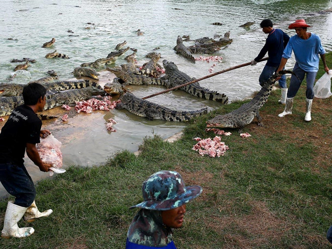 Công nhân nuôi cá sấu tại trang trại cá sấu Sri Ayutthaya ở Thái Lan. Ảnh: Reuters.