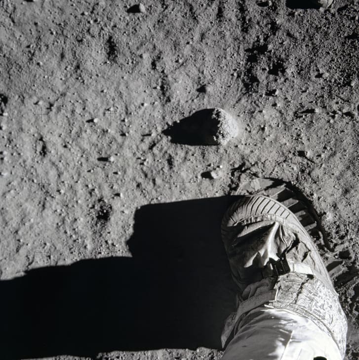 H́nh ảnh bàn chân của Buzz Aldrin trên mặt trăng. Có vẻ như dấu chân vẫn c̣n nguyên vẹn, v́ mặt trăng không có bầu khí quyển hay mưa làm mờ nó