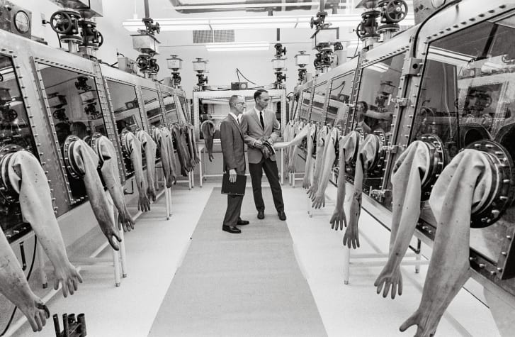 Phi công chỉ huy tàu Apollo 11 Michael Collins kiểm tra Pḥng thí nghiệm tiếp nhận mặt trăng của NASA tại Trung tâm tàu vũ trụ có người lái ở Houston