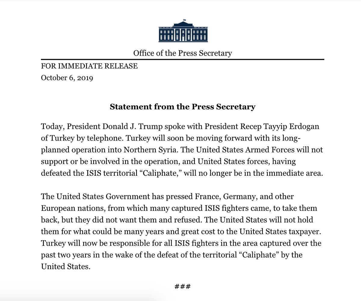 "Hôm nay Tổng thống Donald J. Trump đã trò chuyện với Tổng thống Thổ Nhĩ Kỳ Recep Tayyip Erdogan qua điện thoại. Thổ Nhĩ Kỳ sẽ sớm đưa chiến dịch đã hoạch định từ lâu vào miền bắc Syria. Các lực lượng vũ trang Mỹ sẽ không hỗ trợ hay tham gia vào chiến dịch, và quân Mỹ - đã đánh bại "Vương quốc" lãnh địa IS, sẽ không có mặt ở vùng trực tiếp nữa.