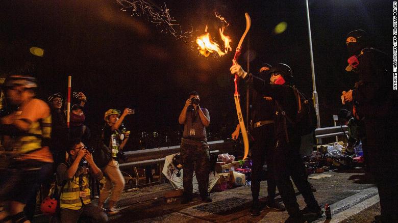 Một người biểu t́nh bắn tên lửa để đốt những chướng ngại vật, ngăn cảnh sát tiến vào đại học Hồng Kông (ảnh: CNN)