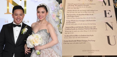 Vợ chồng nữ ca sĩ Giang Hồng Ngọc đã lựa chọn thực đơn gồm các món ăn đến từ Nhật Bản, New Zealand, Indonesia được tổ chức tiệc cưới tại một khách sạn 5 sao ở TP.HCM. Thực đơn cưới của Quán quân X-Factor mùa đầu tiên cũng khiến nhiều người ấn tượng.