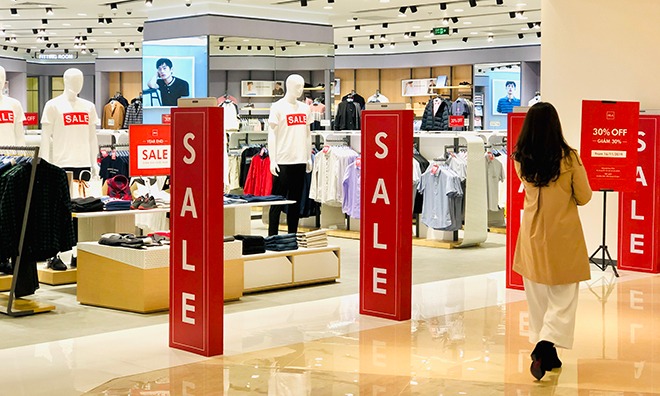 Cửa hàng thời trang đang giảm giá tại trung tâm thương mại ở Trần Duy Hưng. Ảnh: Anh Tú