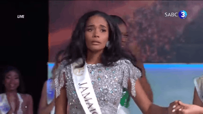 Đại diện người Jamaica bước lên trong sự ngỡ ngàng, sự bối rối của cô không chỉ thể hiện ở gương mặt bất thần mà còn ở mái tóc xoăn dài tự nhiên có chút rối bời.