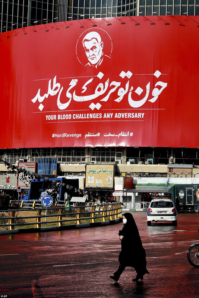 Một tấm biển màu máu trên đường phố Iran, thể hiện quyết tâm "trả thù khốc liệt" cho cái chết của Tướng Soleimani theo lời thề của Đại giáo chủ Ayatollah Ali Khamenei. Ảnh: AP