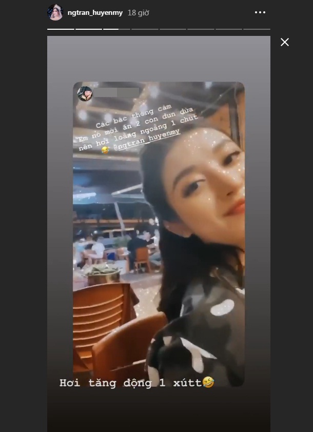 Trước khi ngất xỉu ít giờ, Á hậu Huyền My còn đăng tải hình ảnh thoải mái ăn uống cùng bạn bè, trang điểm xinh đẹp, lên đồ kỹ lưỡng để chuẩn bị cho lịch trình mới: “Các bác thông cảm. Em nó mới ăn hai con đuông dừa nên hơi loằng ngoằng một chút”.