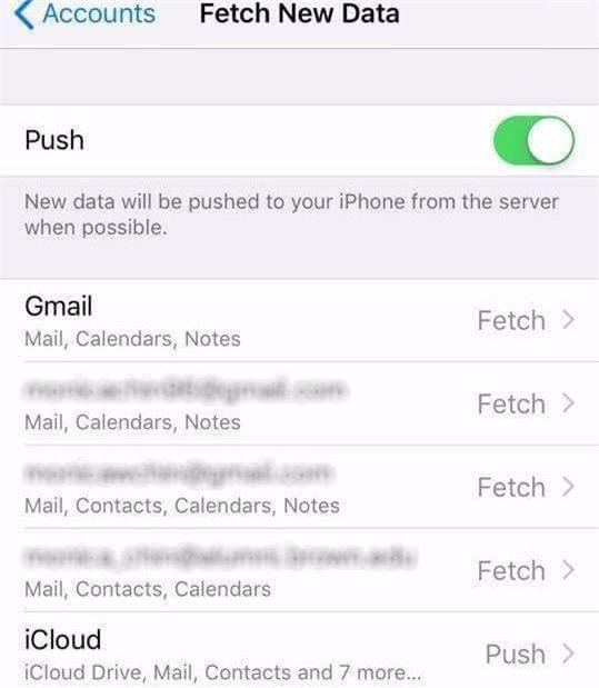 Có 2 cách bạn có thể thiết lập các tài khoản để kiểm tra email mới. Cách 1 lựa chọn Push (kiểm tra và tải xuống trong thời gian thực) hoặc cách 2 lựa chọn Tìm nạp dữ liệu mới (Fetch) - kiểm tra và tải xuống mỗi 15 phút hoặc lâu hơn). Tìm nạp dữ liệu mới sử dụng pin ít hơn do gửi đến máy chủ ít thường xuyên hơn. Các bước thực hiện như sau: Cài đặt--> Tài khoản và mật khẩu--> Tìm nạp dữ liệu mới và chọn "Tìm nạp" cho mỗi tài khoản.