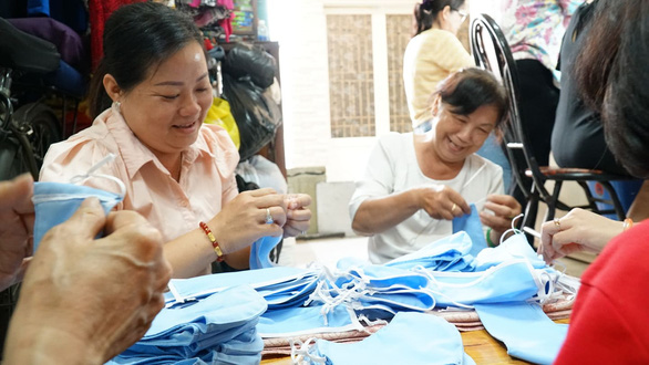 Đây vốn là tiệm may nhỏ. Tận dụng máy may sẵn có, bà chủ tiệm hướng dẫn các bà, các chị trong khu phố cách may, ráp khẩu trang sao cho đẹp. Người nào biết đạp máy thì ngồi may. Những người còn lại phụ trách khâu kết quai, giặt, ủi, vô bọc.