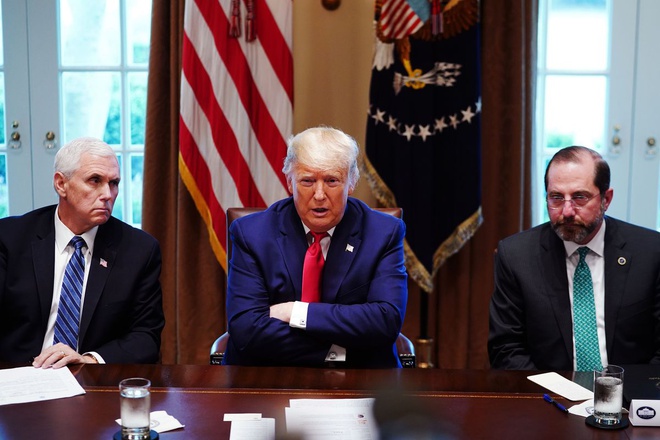Tổng thống Mỹ Donald Trump cùng Phó tổng thống Mike Pence và Bộ trưởng Y tế và Dịch vụ Nhân sinh Alex Azar. Ảnh: AFP.