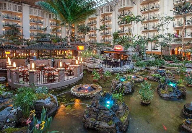 Là một trong 30 khách sạn lớn nhất thế giới, Gaylord Opryland nổi tiếng với khu công viên rộng mênh mông của ḿnh, nơi du khách có thể chiêm ngưỡng khu vườn trong nhà tuyệt đẹp với hàng trăm loài thực vật hay đi thuyền trên ḍng sông nhân tạo với nước được lấy từ 1.700 con sông trên khắp thế giới.