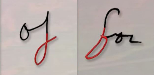 Cách hai người viết "I" cũng khác nhau, Nancy thường gạch ngang ở đầu và chân chữ "I", trong khi chữ của Richard thường chỉ là nét dọc duy nhất. Phần chân của chữ "f" thường, Nancy thường viết theo chiều ngược kim đồng hồ, trong khi Richard viết theo chiều kim đồng hồ.