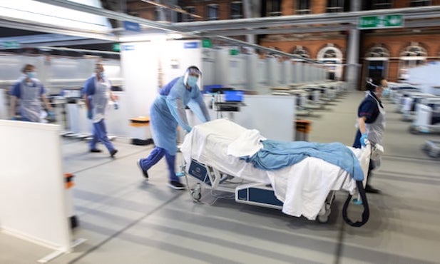 Nhân viên NHS tại một bệnh viện dă chiến mới ở Manchester, Anh gấp rút chăm sóc cho bệnh nhân mắc COVID-19. Ảnh: LNP