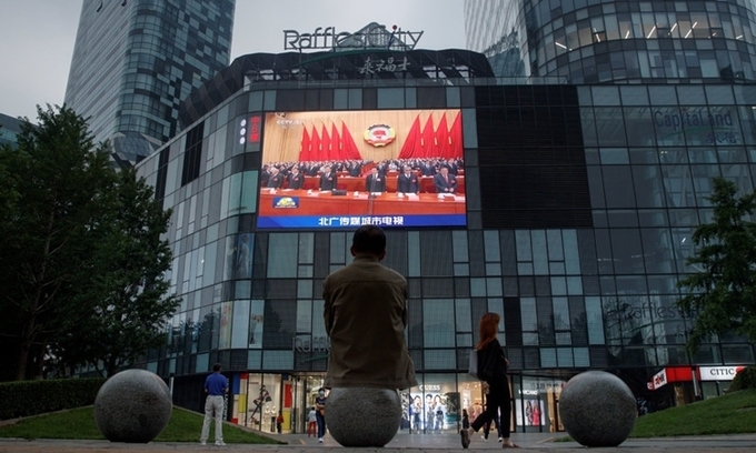 Màn h́nh ở Bắc Kinh chiếu phiên họp quốc hội Trung Quốc hôm 22/5. Ảnh: Reuters.
