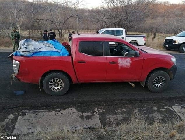Tại hiện trường, các thi thể được xếp chồng lên nhau đằng sau một chiếc xe bán tải màu đỏ. Chiếc xe bị bỏ lại ở con đường dẫn vào thị trấn El Terreno Prieto.
