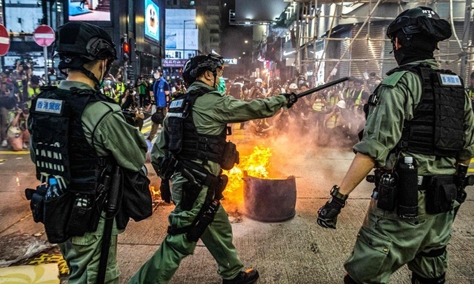 Cảnh sát Hong Kong đứng chặn một con đường để ngăn người biểu t́nh tại quận Mong Kok hôm 27/5. Ảnh: AFP.