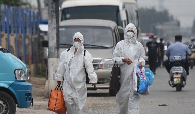 Hai người phụ nữ mặc đồ bảo hộ đi bộ trên một con phố gần chợ Xinfadi, Bắc Kinh. Ảnh: AFP