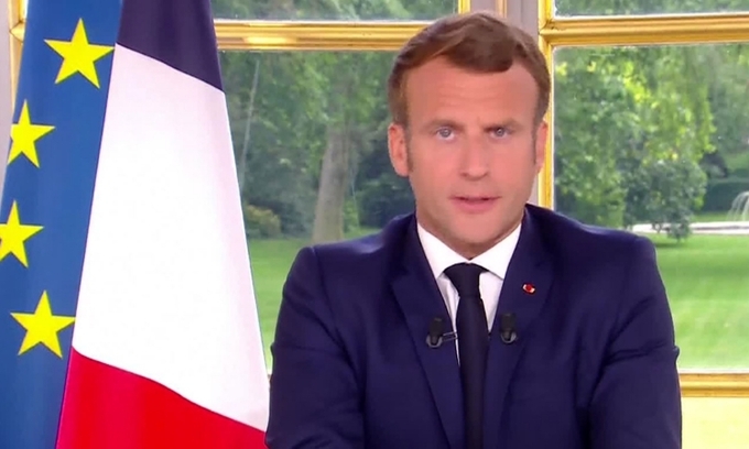 Tổng thống Pháp Emmanuel Macron phát biểu trên truyền hình nhà nước hôm 14/6. Ảnh: Reuters.