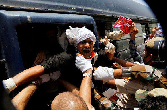 Cảnh sát bắt giữ thành viên của nhánh Swadeshi Jagran Manch, thuộc tổ chức Rashtriya Swayamsevak Sangh (RSS) theo tư tưởng dân tộc chủ nghĩa Hindu, trong cuộc biểu t́nh chống Trung Quốc ở thủ đô New Delhi, ngày 17-6 - Ảnh: REUTERS