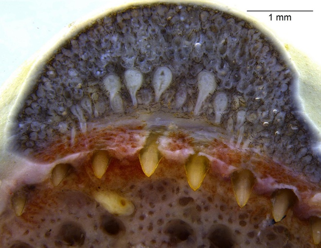 Các túi chứa dung dịch phía bên dưới hàm răng của loài caecilian. Ảnh: Carlos Jared.