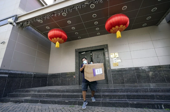 Nhân viên giao hàng ôm thùng carton bước ra khỏi lãnh sự quán hôm 23/7. Ảnh: AP