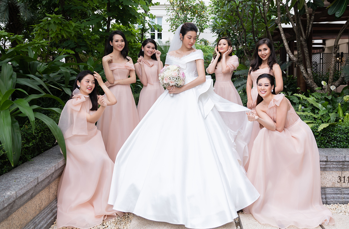 Dàn phụ dâu hoa hậu, á hậu bên người đep Thúy Vân nô đùa bên nhau với phụ dâu á hậu, hoa hậu như Khánh Vân, Thùy Dung... trước giờ diễn ra hôn lễ tối 25/7, với đám cưới dự kiến quy tụ khoảng 250 khách.