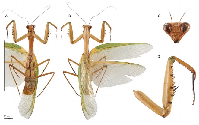 Hình ảnh giải phẫu các bộ phận bên ngoài của loài bọ ngựa Titanodula attenboroughi mới được phát hiện ở Việt Nam. Ảnh: Belgian Journal of Entomology.