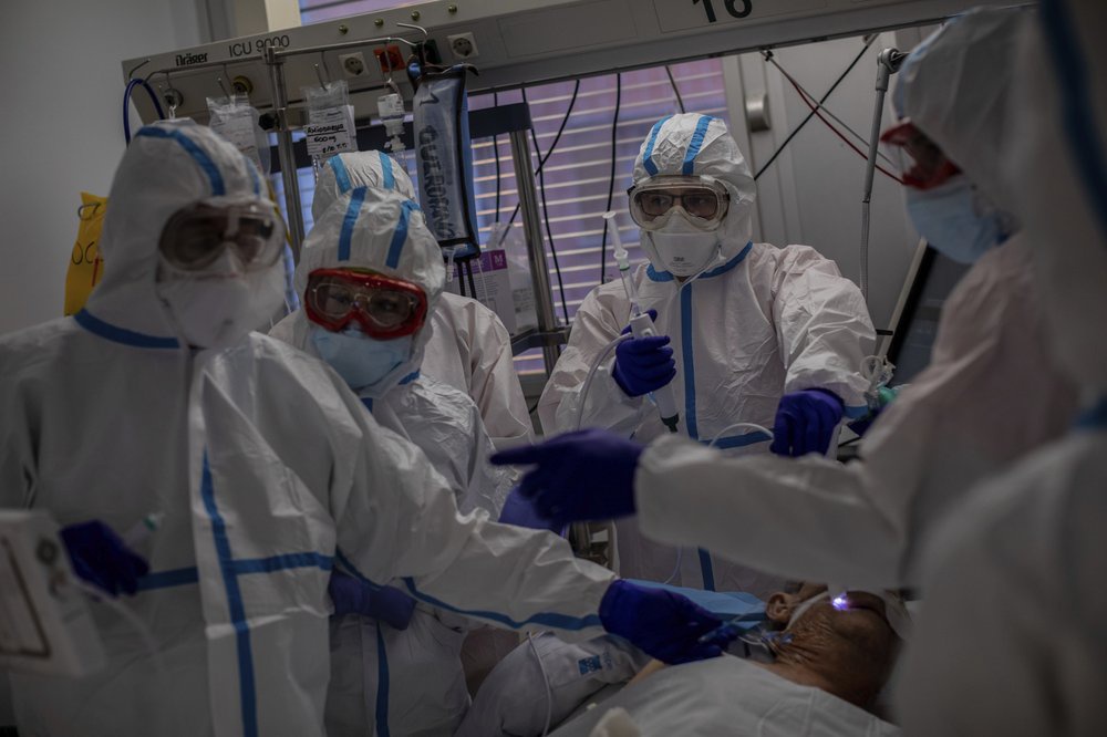 Nhóm bác sĩ điều trị cho một bệnh nhân Covid-19 ở Mandrid, Tây Ban Nha, ngày 9/10. Ảnh: AP.Châu Âu vẫn "chạy theo sau" đại dịch