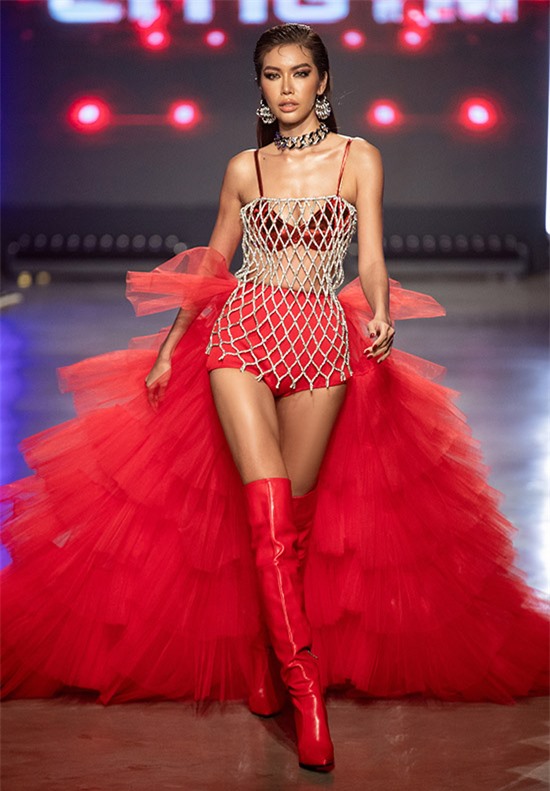 Hoa hậu Tiểu Vy mở màn show diễn với thiết kế kết hợp chất liệu da và lưới ánh kim, trông khoẻ khoắn, sexy.