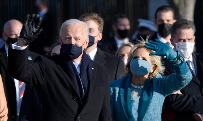 Tổng thống Mỹ Joe Biden và Đệ nhất phu nhân Jill Biden trên Đại lộ Pennsylvania hôm 20/1. Ảnh: AFP.