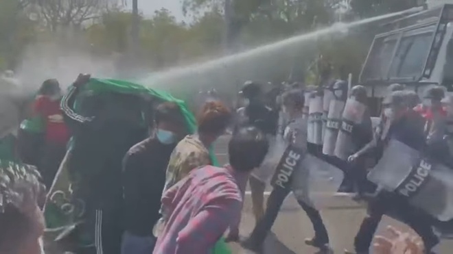 Video do Reuters công bố cho thấy cảnh người biểu tình đang đối đầu với cảnh sát ở Myanmar hôm 9/2 thì bị lực lượng hành pháp sử dụng vòi rồng để trấn áp.