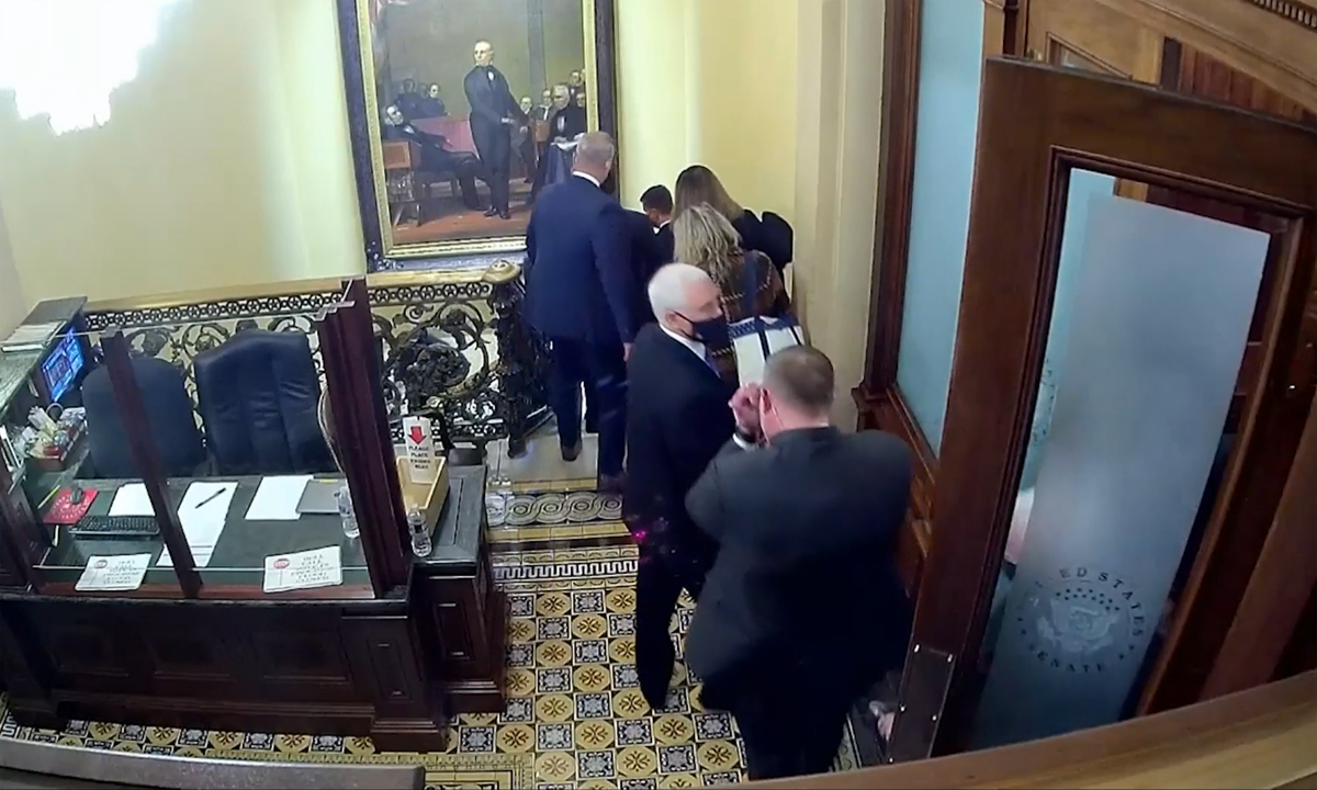 Cựu tổng thống Pence (tóc trắng) cùng các thượng nghị sĩ di tản khỏi pḥng họp ngày 6/1. Video: Washington Post.