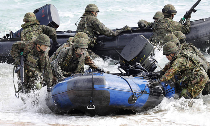Binh sĩ Lực lượng Phòng vệ Nhật Bản diễn tập đổ bộ với thủy quân lục chiến Mỹ tại Kin, tỉnh Okinawa, tháng 2/2020. Ảnh: Kyodo.