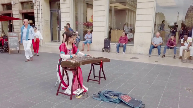 Cô chậm rãi gẩy những dây đàn thanh mảnh. Từ những ngón tay điêu luyện, các nốt nhạc đẹp đẽ vang lên với âm thanh lúc trong trẻo, khi trầm bổng, khiến nhiều vị khách đi qua không thể không dừng lại xem.