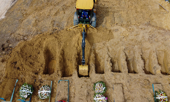 Một máy kéo đang đào mộ cho các nạn nhân Covid-19 trong khu vực mới thuộc nghĩa trang Nossa Senhora Aparecida ở thành phố Manaus, Brazil, hôm 8/1. Ảnh: AFP.