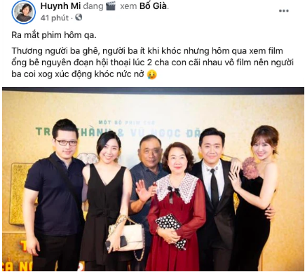 Trấn Thành viết: "Tối qua ba em nhắn. Thương ghê. Lúc nào cũng hy sinh và thầm lặng.. Ba em khác em nhiều, đặc biệt là khoảng khóc. Em thì thường trực, ba thì không bao giờ! Nhưng hôm qua, ba khóc nấc thành tiếng khi xem xong phim. Chưa bao giờ thấy ba khóc nhiều như vậy.