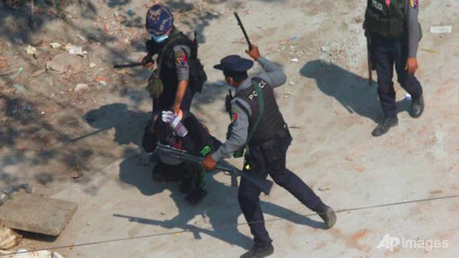 Cảnh sát Myanmar bắt giữ người biểu t́nh. Ảnh: Reuters