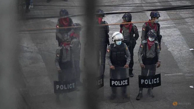 Cảnh sát chống bạo động ở ngoại ô thành phố Yangon, Myanmar, hôm 6/3. Ảnh: AP