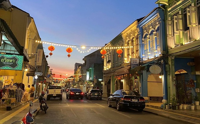 Vào một đêm cuối tuần gần đây ở Phuket, nhiều cửa hàng và nhà hàng đă đóng cửa, chỉ một số ít du khách trong nước chụp ảnh trên phố đi bộ được trang trí bằng đèn lồng đỏ từ đợt Tết nguyên đán.