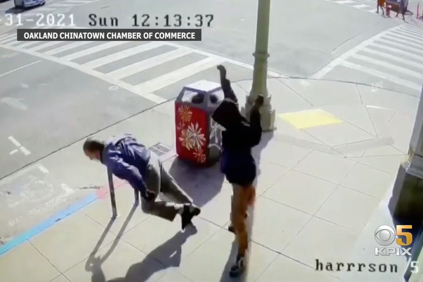 Camera an ninh ghi lại h́nh ảnh một vụ tấn công nhắm vào người gốc Á ở Mỹ. Ảnh: KPIX.