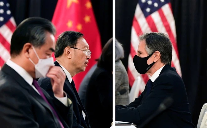 Từ trái sang: Bộ trưởng Ngoại giao Trung Quốc Vương Nghị, Ủy viên Quốc vụ viện Dương Khiết Tŕ, Ngoại trưởng Mỹ Blinken và Cố vấn an ninh quốc gia Jake Sullivan tại cuộc gặp ở Alaska. Ảnh: Nikkei.