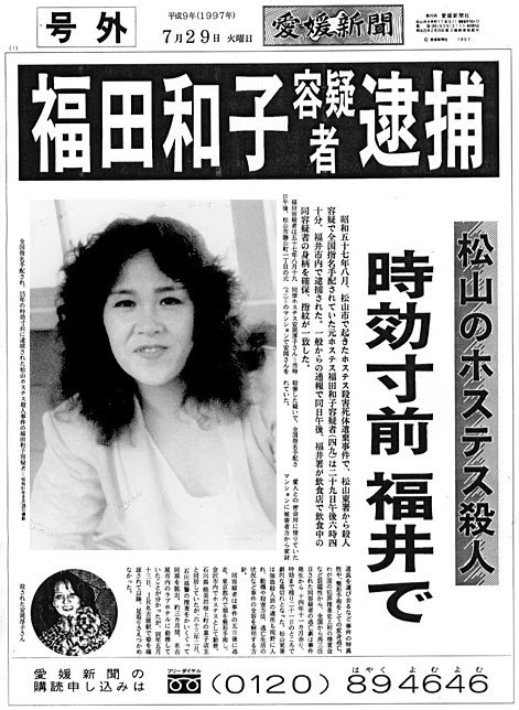 Trang nhất của tờ báo Ehime Shimbun số ra ngày 29 tháng 7 năm 1997 chạy ḍng tít lớn: “Nghi phạm Kazuko Fukuda bị bắt" như một lời thông báo cho "chiến công" hiển hách của cảnh sát sau gần 15 năm đằng đẵng đuổi theo kẻ sát nhân.