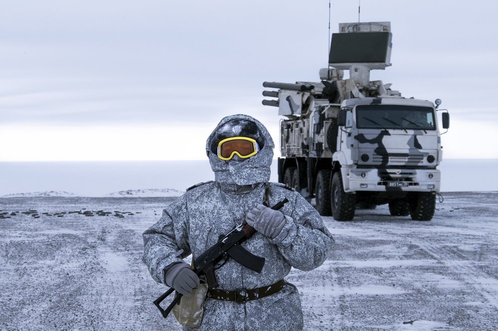 Binh sĩ Nga đứng gác cạnh tổ hợp pḥng không Pantsir-S1 trên đảo Kotelny, Nga. Ảnh: AP.