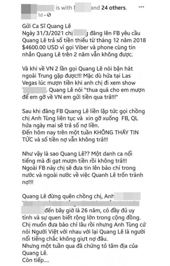 Mới đây, trên mạng xã hội bất ngờ xuất hiện trước bài viết tố ca sĩ Quang Lê vay nợ số tiền 4.600 đô la (tương đương 106 triệu đồng) từ tháng 12/2018 nhưng đến nay vẫn chưa trả.