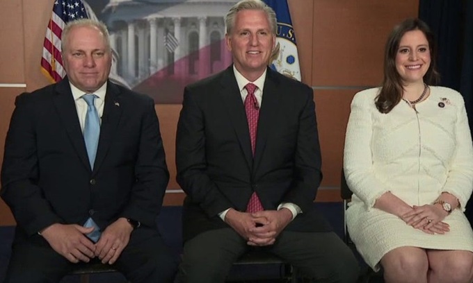 Từ trái qua phải: Steve Scalise, Kevin McCarthy và Elise Stefanik trong cuộc phỏng vấn chung hôm 14/5. Ảnh: Fox.