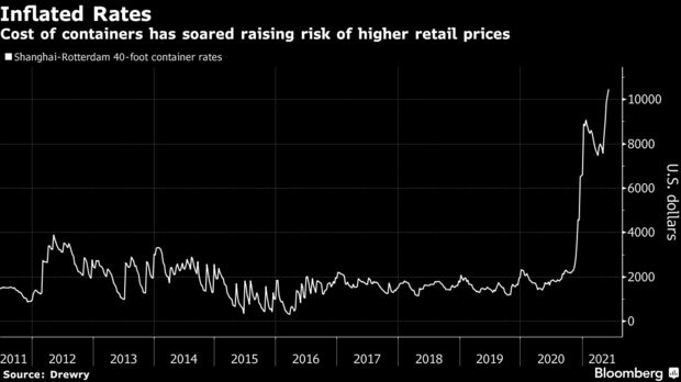 Giá cước container tăng chóng mặt. Nguồn: Bloomberg