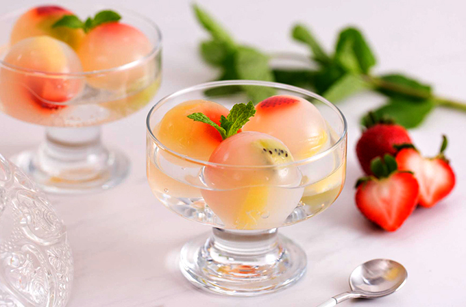 Cho trái cây vào khay tròn, đổ nước rau câu ở bước 1 vào. Cho vào tủ lạnh, để lạnh khoảng một tiếng cho đông lại, tách ra khỏi khuôn là có thể dùng ngay. Nếu không có khay đá hình khối cầu, bạn có thể thay bằng khay có bất kỳ hình dáng nào cũng được.