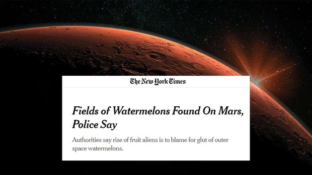 Bài viết có tựa đề "Cảnh sát cho biết đă t́m thấy cả một ruộng dưa hấu trên sao Hỏa". Tuy nhiên, bên trong bài lại có ít thông tin đến nực cười. Chỉ vỏn vẹn 2 câu dường như không liên quan lắm: "FBI từ chối b́nh luận về thông báo có mưa dưa hấu, nhưng xác nhận rằng kiwi đă bị chặn. Một câu chuyện chán ngắt."