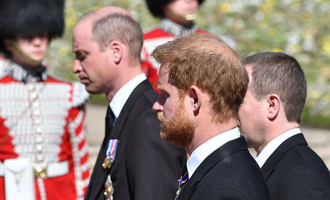William và Harry dự đám tang ông nội, Hoàng thân Philip, hồi tháng 4. Ảnh: AFP.